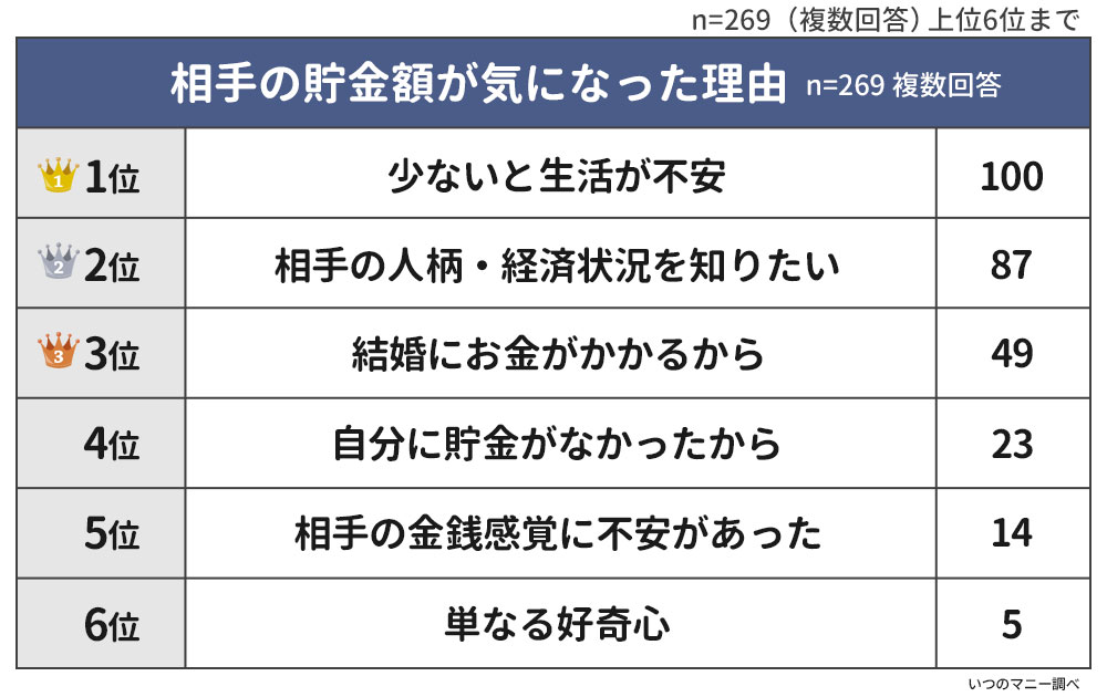 結婚相手の貯金額が気になった269名に「貯金額が気になった理由」を聞いたところ、回答は以下のようになりました。