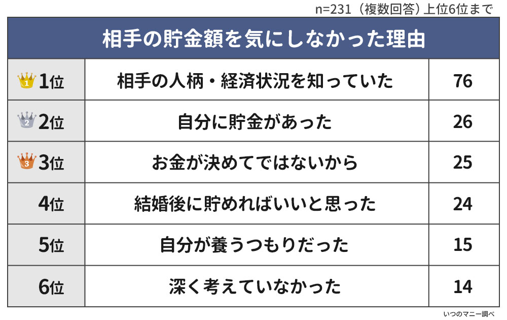結婚相手の貯金額が気にならなかった理由1位は「相手の人柄・経済状況を知っていた」